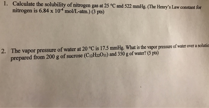 3. The solubility of nitrogen gas at 25°C and a nitrogen pressure of 522 torr is 4.7 × 10–4 mol/L. What is the value of the Henry's Law ... Fetch Full Source